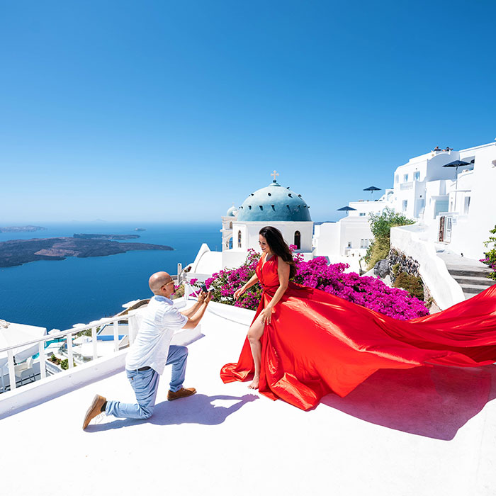 Begin an extraordinary experience as we guide you through the best spots for a flying dress proposal in Santorini. From the world-famous blue domes of Oia to the majestic cliffs of Imerovigli and Fira, every location has been carefully chosen to elevate your moment.